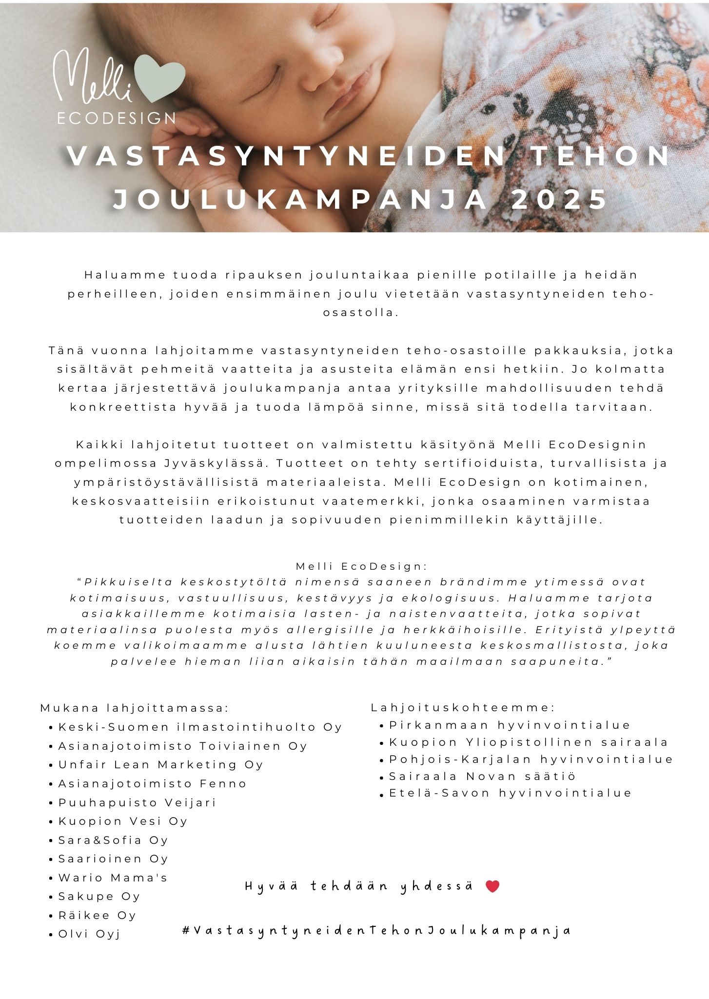 - Vastasyntyneiden teho- ja valvontaosastolle lahjoitettu Melli EcoDesign Oy:n suunnittelemia ja valmistamia vauvanvaatepaketteja. Lahjoituksen mahdollistivat seuraavat yritykset: